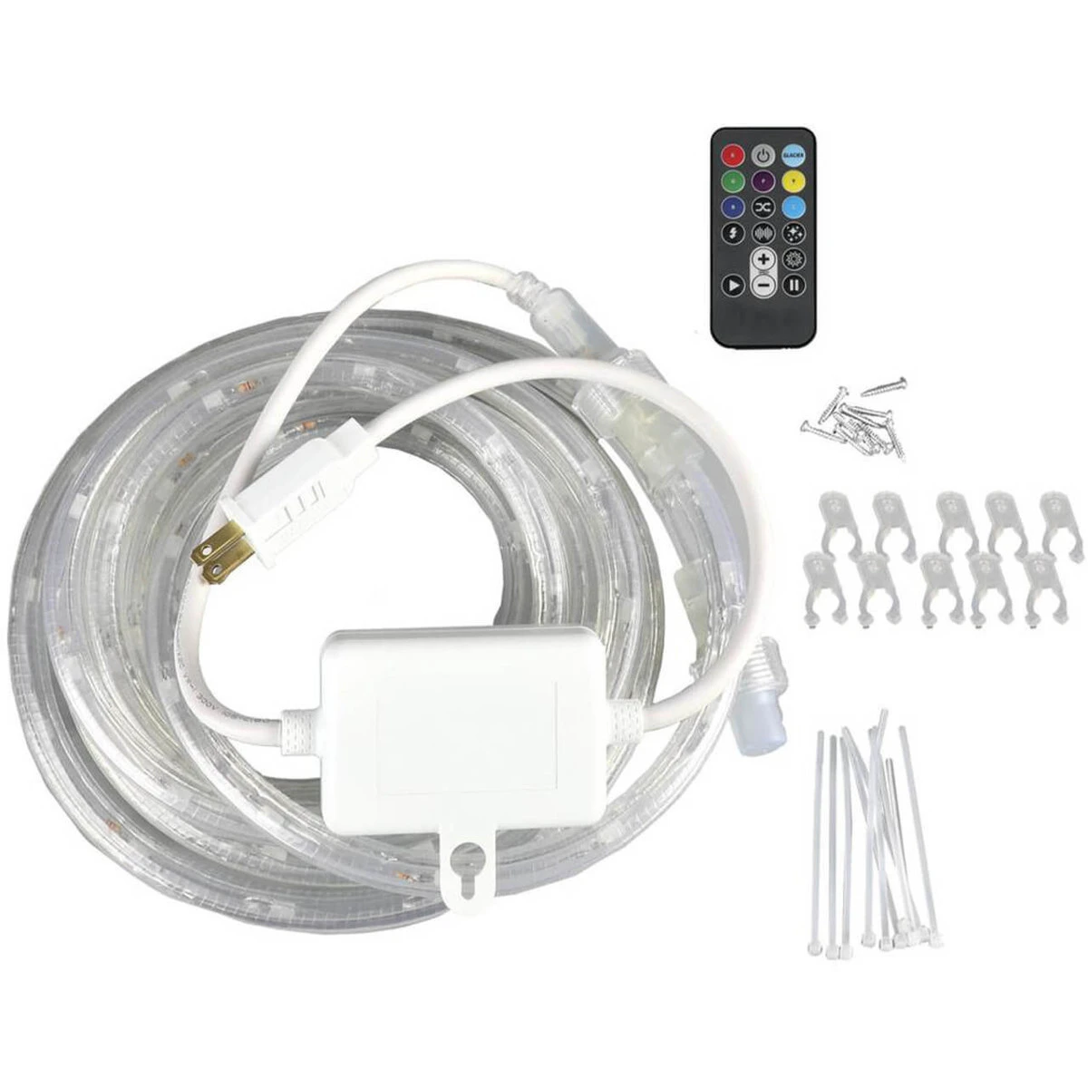 Upgrade your home indoors and out with this 12ft. LED rope light from Pinegreen Lighting. This LED rope light includes 7 color changing settings and 4 lighting features and the ability to link additional units up to 180ft. This kit not only includes the rope light itself as well as zip ties, mounting clips, screws, and a remote control.