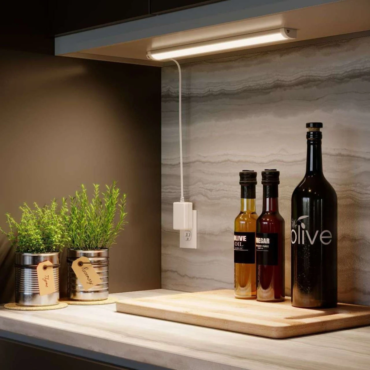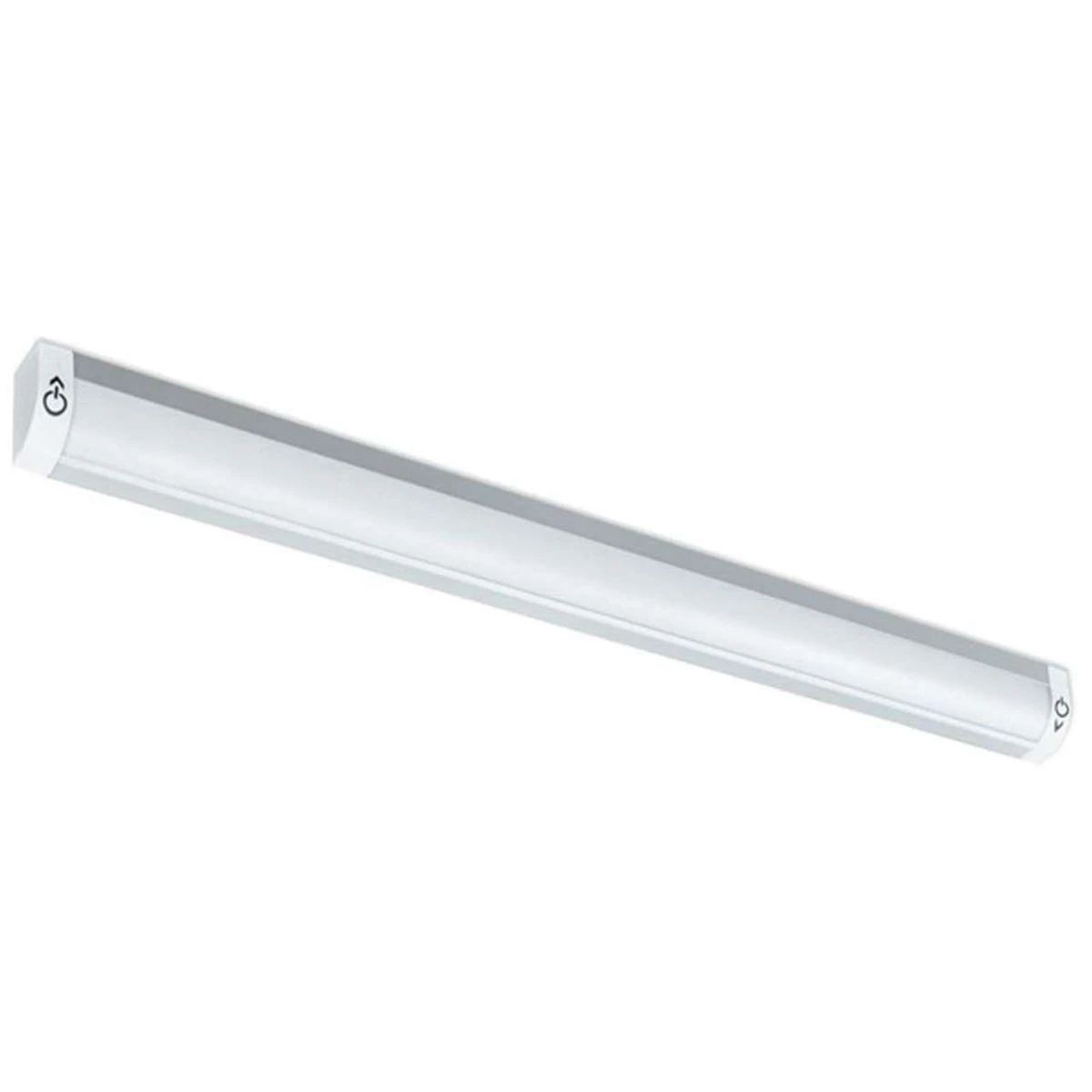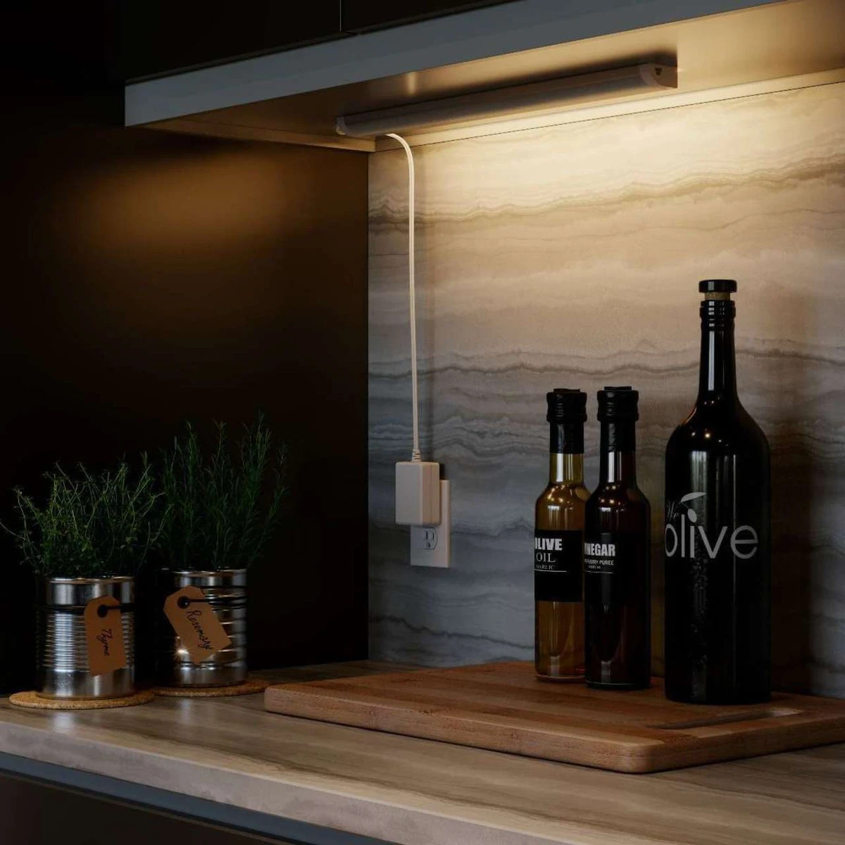 This 18in. LED Touch Control Under Cabinet Light has two color temperature options that are ideal for different tasks. This light has a built-in touch control that can easily be turned on, off and dimmed. The user simply has to hold the touch sensor. The two color temperatures include 4000K bright white light for task work or cooking and 3000K warm white for backsplash accent lighting. (Both color temperatures can also be turned on at the same time.) It is constructed of aluminum alloy and plastic with a brushed aluminum and black finish and frosted lens. Additionally, it is more energy-efficient than fluorescent lighting and a rated lifespan of 50,000 hours. This light is easy to install with no direct wiring. It is simply mounted, and the mounting hardware is included with this under cabinet light. Other notable specs include:
