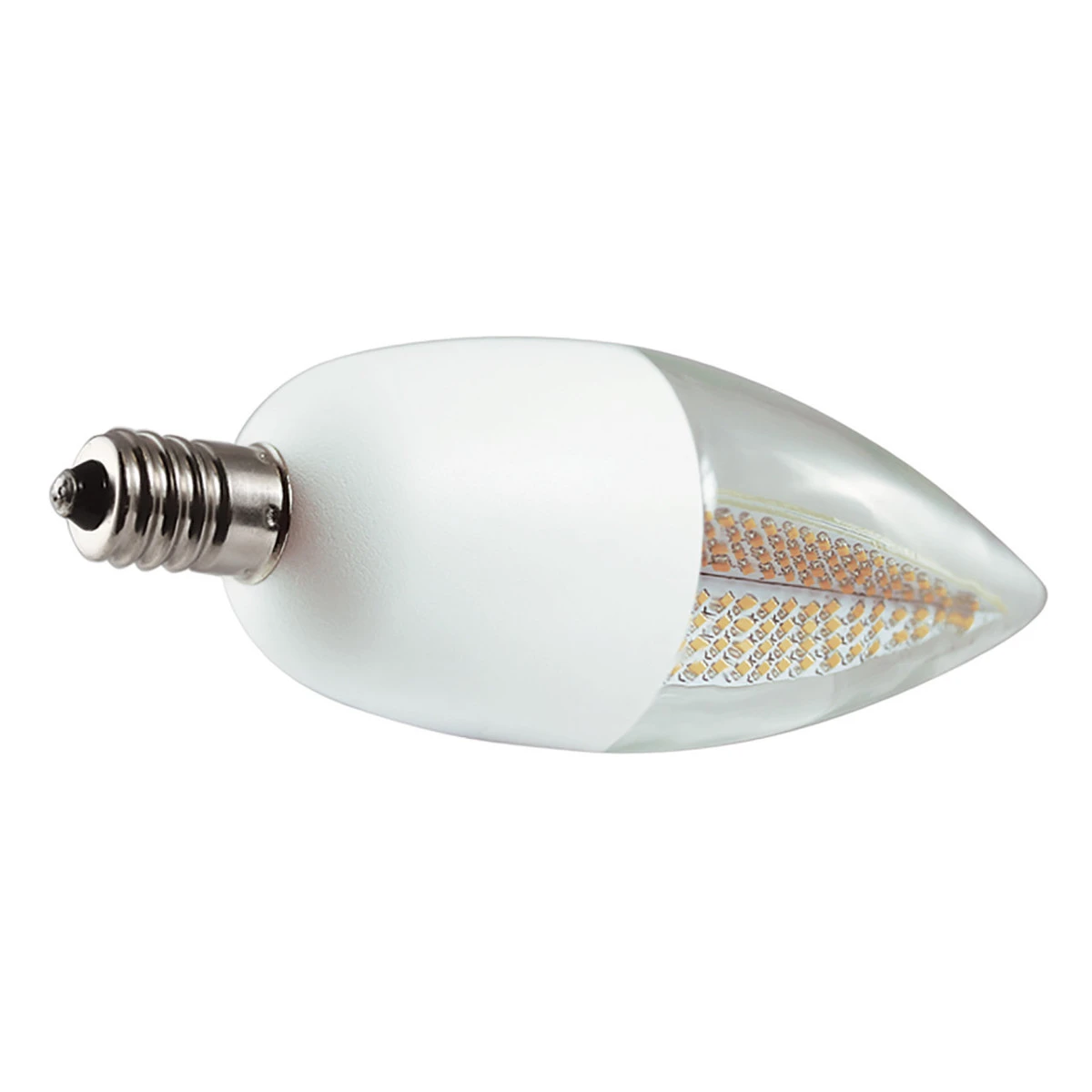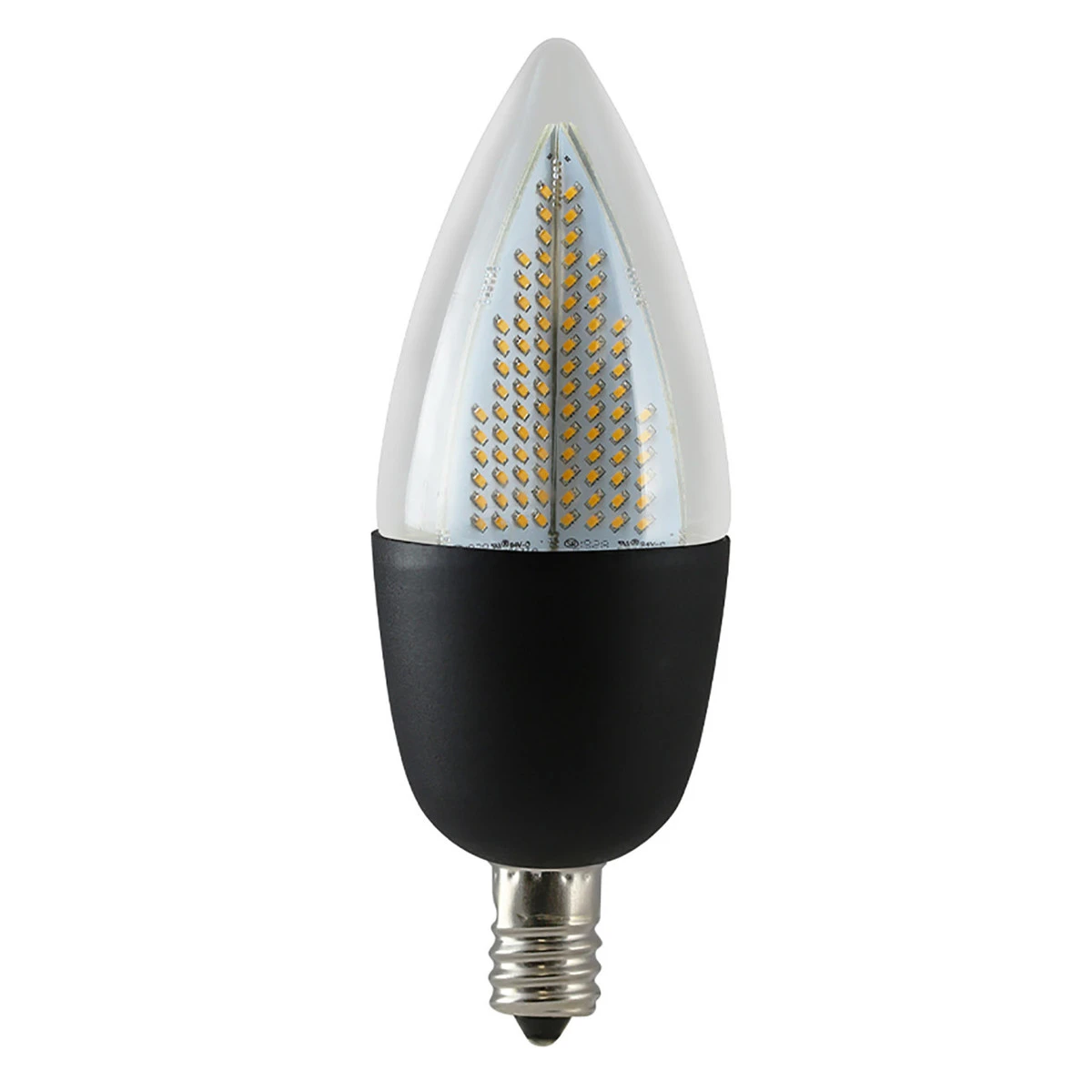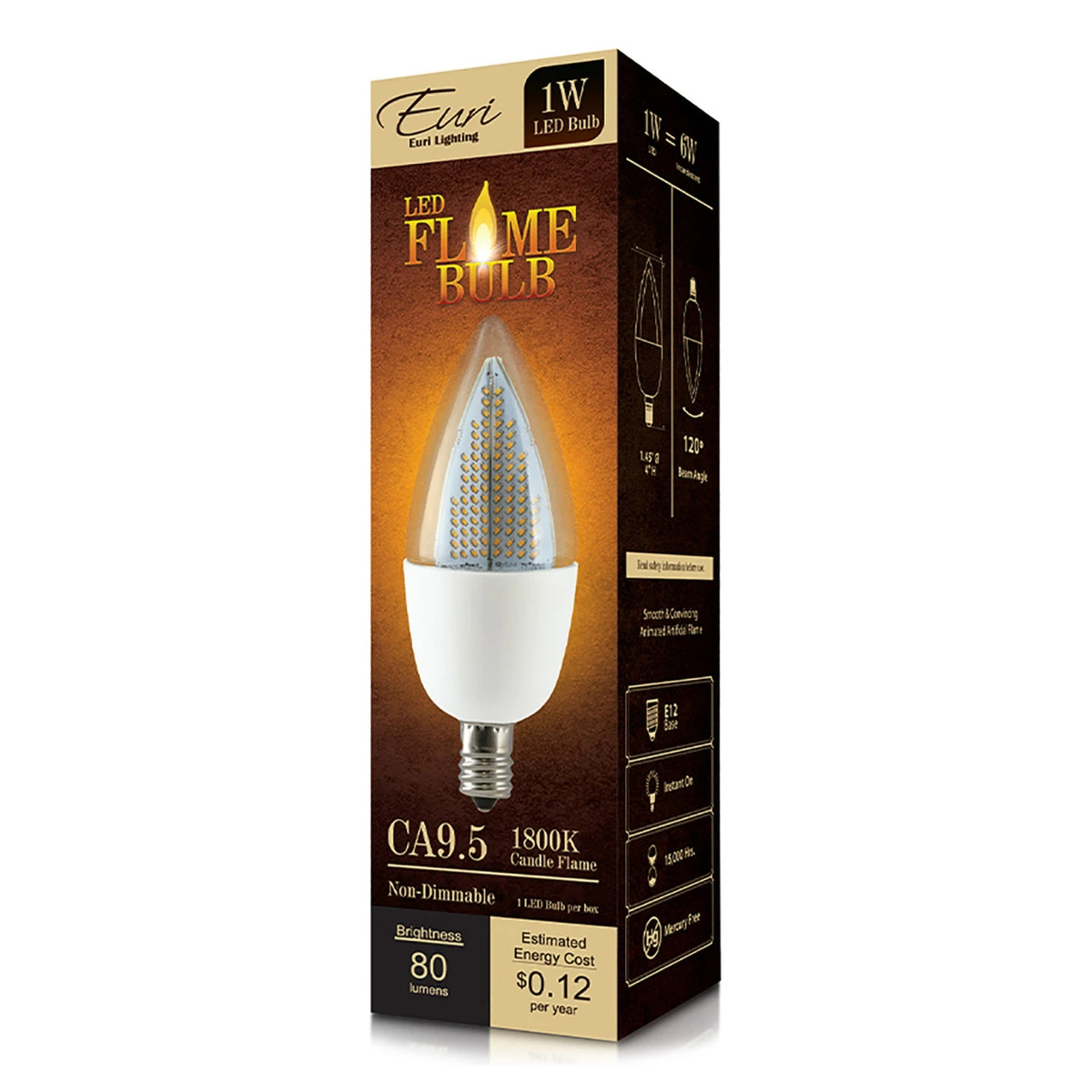 This LED flickering flame bulb is what you need to accent and decorate outdoor lanterns to indoor chandeliers. This long-lasting and energy-efficient flame bulb simulates a natural, flickering flame. Its color temperature is 1800K (Candle Light) and offers a clear glass lens and flame shaped body. This LED bulb uses only 1W and is equivalent to a 6W incandescent bulb. It emits 80 lumens and is non-dimmable. This bulb is also UL Listed and available in two different base colors: black and white.