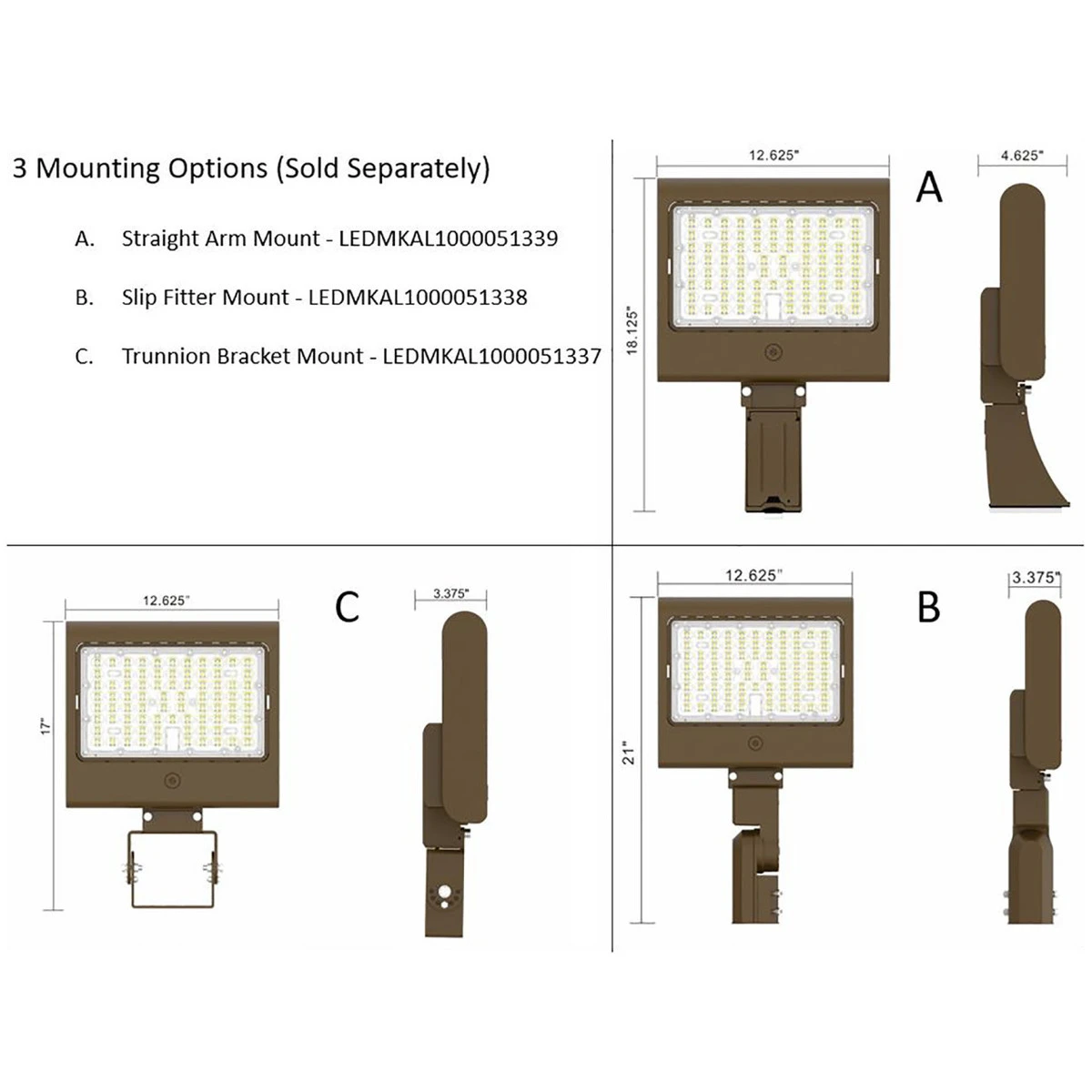 Three different mounting brackets are available for purchasing separately – Straight Arm Fixed Mount (LEDMKAL1000051339), Slip Fitter Pole Mount (LEDMKAL1000051338), and Adjustable Trunnion Bracket Mount (LEDLHLS1000051337). Twist-Lock photocell is also available as SKU LEDLHLS1000050699.